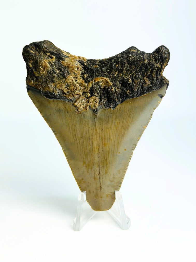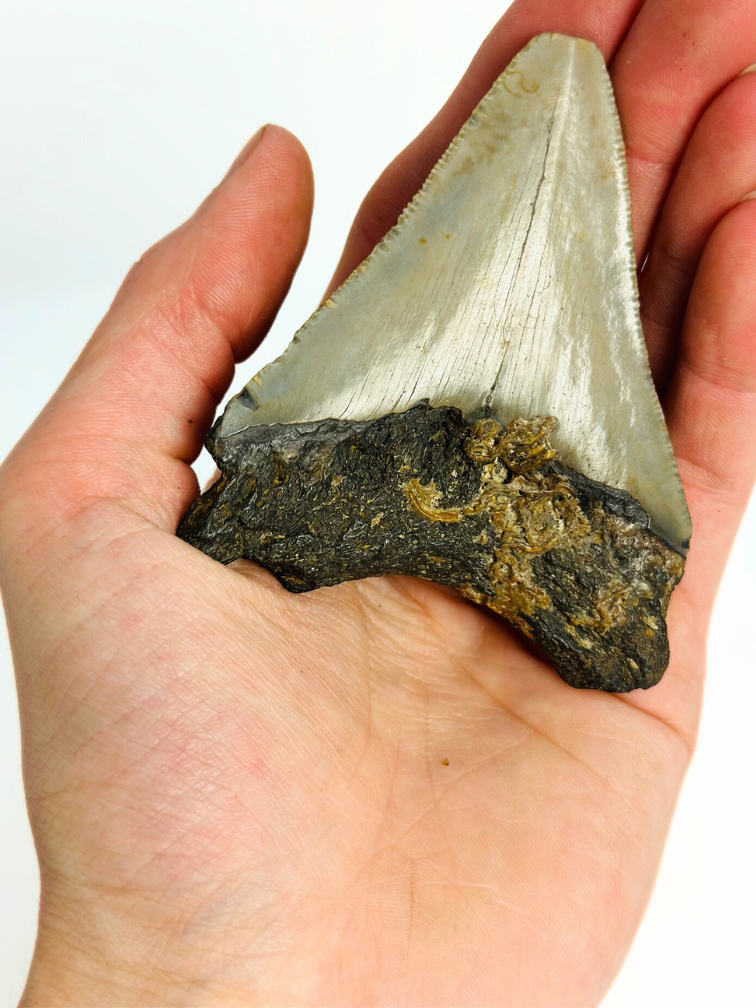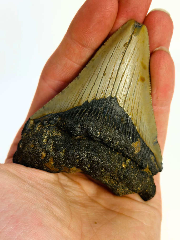 Größe: Megalodon-Zähne variieren zwischen 4 cm und 19 cm. Außerdem werden Megalodon-Zähne in manchen Fällen restauriert, so dass die Wurzel etwas größer sein kann und sich der Zahn auch leichter anfühlt. Dies bedeutet nicht, dass der Zahn eine Fälschung ist. Der Zahn ist einfach zu 100 % echt, allerdings ist beim Abbau oder bei der Oberflächenbearbeitung etwas abgebrochen. Um den Zahn dennoch in seiner vollen Pracht wiederherzustellen, werden oft die Wurzel und sehr selten der Zahnschmelz restauriert.