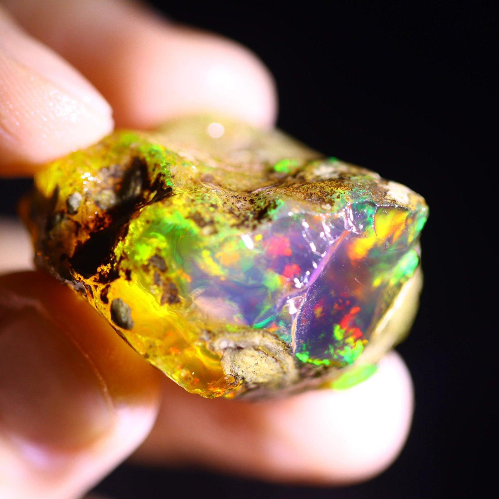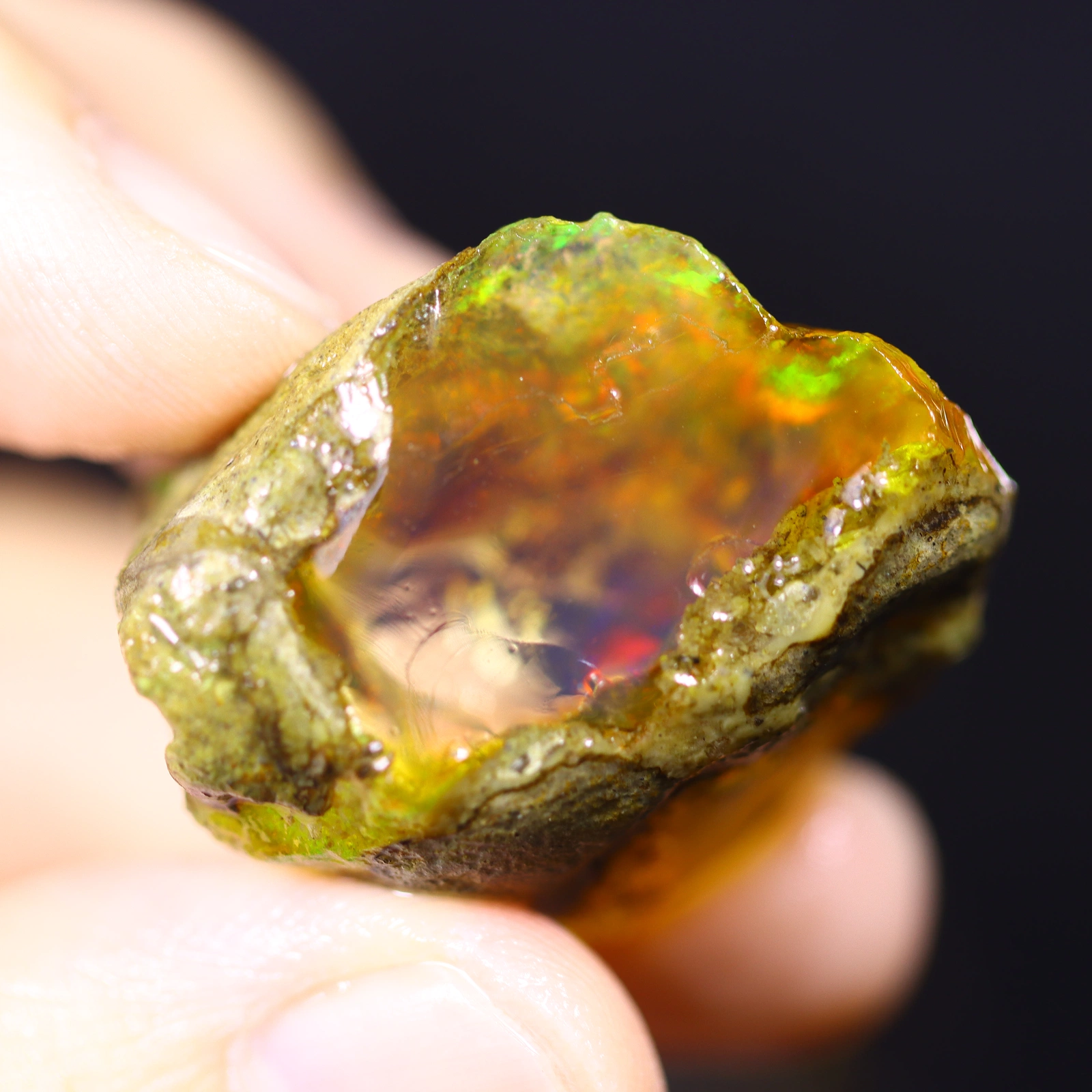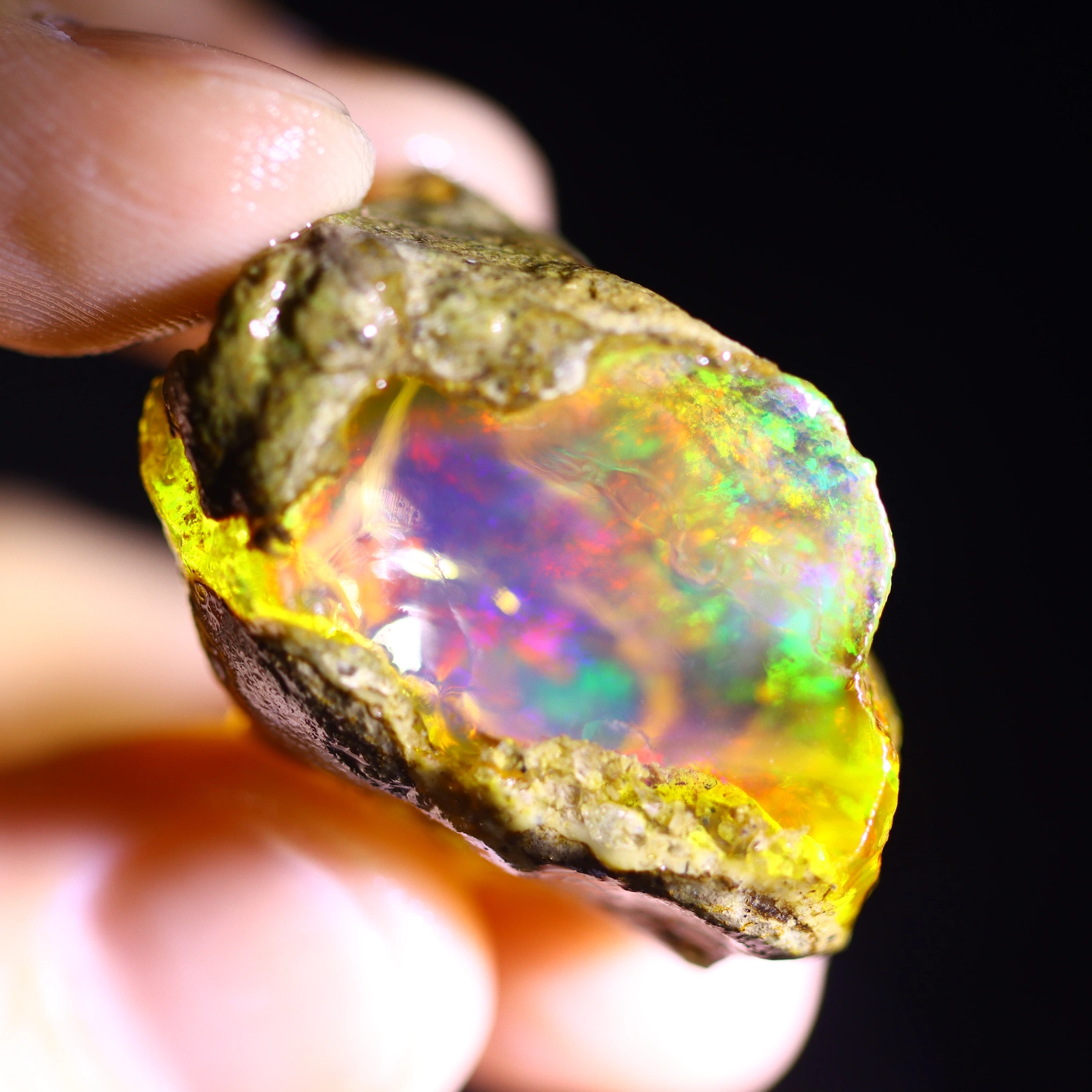 Dieser einzigartige Rohkristallopal, der in Äthiopien gefunden wurde, weist eine noch nie dagewesene Farbpalette auf. Kristallopale profitieren am meisten davon, wenn sie feucht gehalten werden. So kommen auch die schönsten Farben zum Vorschein. Dieser geheimnisvolle Rohopal ist eine perfekte Ergänzung für jede Sammlung. Diese Opalvarietät wird für ihr schönes Farbenspiel geliebt. Wie Sie auf dem Bild sehen können, hat der Opal ein schönes raues Aussehen mit ausgeprägten Farben.