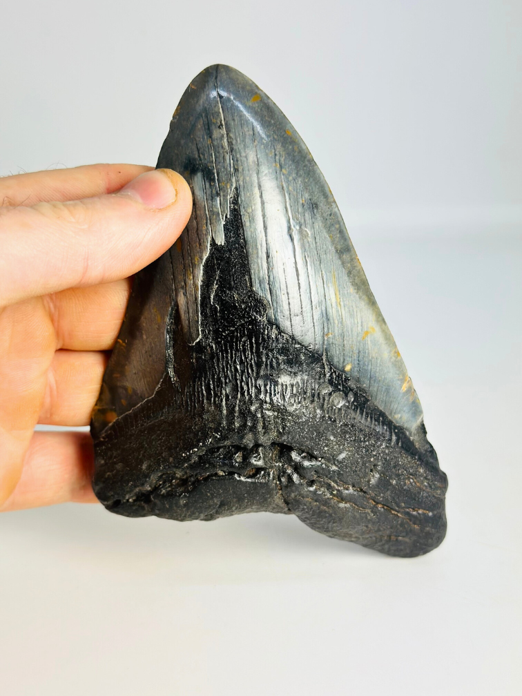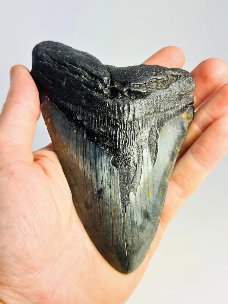 Size: Megalodon teeth vary between 4 cm and 19 cm. In addition, in some cases Megalodon teeth are restored, as a result the root may be slightly larger and the tooth may also feel lighter. This does not mean that the tooth is fake. The tooth is just 100% real, however, something has broken off during mining or surfacing. To still restore the tooth to its full glory, often the root and very occasionally the enamel are restored.