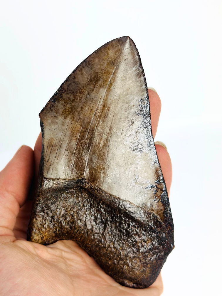 Poseer un diente de Megalodon ofrece una oportunidad excepcional de tener un pedazo de la prehistoria en sus manos. El diente de Megalodon es un fósil bello, raro y valioso. Además, estos dientes son un complemento único para cualquier colección y una magnífica apertura para un tema de conversación.