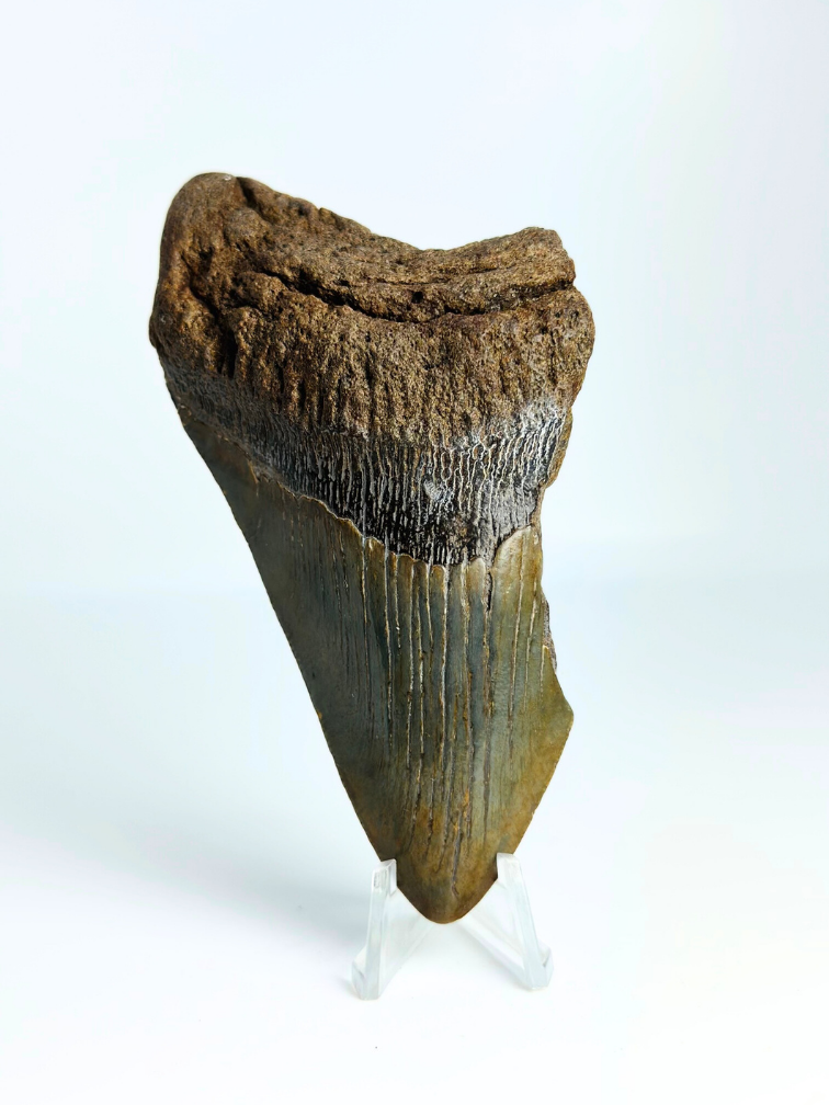 Historia y misterio: Este titán vivió hace entre 23 y 3,6 millones de años y fue el único dominador de nuestros océanos. Los magníficos dientes de Megalodon son los únicos fósiles que han sobrevivido de este animal único. Esto hace que los dientes de Megalodon no sólo sean raros como único fósil superviviente, sino también impresionantes.