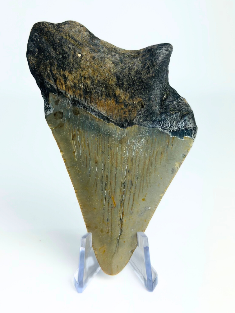 'Earth's Power' un diente de Megalodon único procedente de EE.UU.. Este diente presenta una longitud de 8,1 cm (3,19 pulgadas) con un hermoso color gris. El diente en sí es elegante. El diente todavía tiene bonitos bordes y un bonito bourlette. El diente pesa 56 gramos.