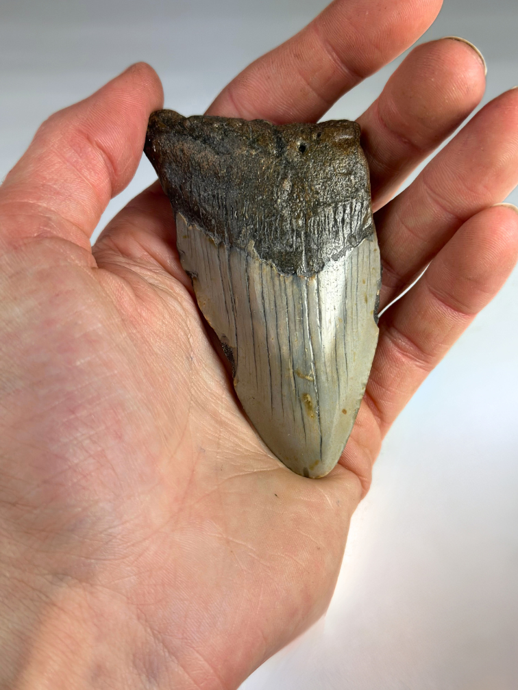 Tamaño: Los dientes de Megalodon varían entre 4 cm y 19 cm. Además, en algunos casos los dientes de Megalodon están restaurados, por lo que la raíz puede ser ligeramente más grande y el diente también puede parecer más ligero. Esto no significa que el diente sea falso. El diente es 100% real, sin embargo, algo se ha roto durante la extracción o la superficie. Para seguir devolviendo al diente todo su esplendor, a menudo se restaura la raíz y muy ocasionalmente el esmalte.