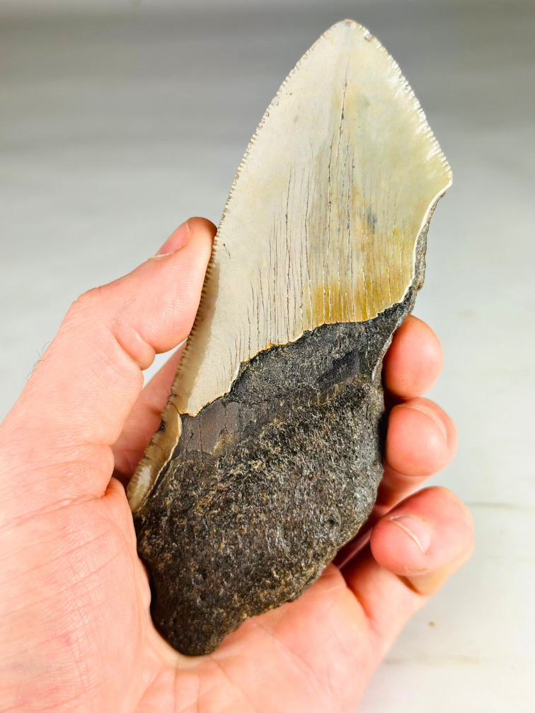 Tamaño: Los dientes de Megalodon varían entre 4 cm y 19 cm. Además, en algunos casos los dientes de Megalodon están restaurados, por lo que la raíz puede ser ligeramente más grande y el diente también puede parecer más ligero. Esto no significa que el diente sea falso. El diente es 100% real, sin embargo, algo se ha roto durante la extracción o la superficie. Para seguir devolviendo al diente todo su esplendor, a menudo se restaura la raíz y muy ocasionalmente el esmalte.