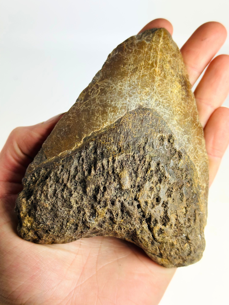 Tamaño: Los dientes de Megalodon varían entre 4 cm y 19 cm. Además, en algunos casos los dientes de Megalodon están restaurados, por lo que la raíz puede ser ligeramente más grande y el diente también puede parecer más ligero. Esto no significa que el diente sea falso. El diente es 100% real, sin embargo, algo se ha roto durante la extracción o la superficie. Para seguir devolviendo al diente todo su esplendor, a menudo se restaura la raíz y muy ocasionalmente el esmalte.