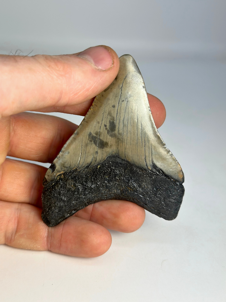 «Arma de los antiguos», un diente de Megalodon único procedente de EE. UU. Este diente mide 8 cm (3,15 pulgadas) de largo y tiene un hermoso tono gris. El diente tiene una forma elegante, una hermosa raíz y bordes preciosos. Este diente pesa 58 gramos.