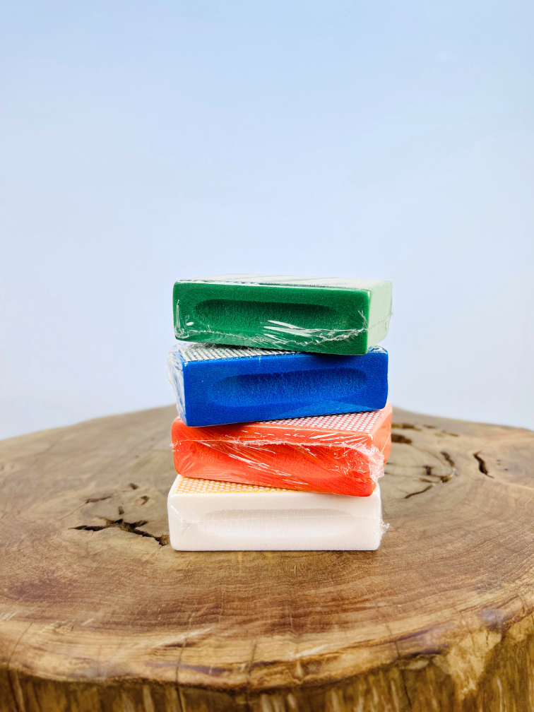- K-1500 (esponja azul): La esponja de pulido K-1500 es perfecta para el pulido fino y el alisado de diversas superficies, como ópalos y piedras preciosas. Gracias a su estructura de grano fino (K-1500), esta esponja elimina los arañazos ligeros y proporciona un bonito acabado brillante. Ideal para uso manual en trabajos de detalle.