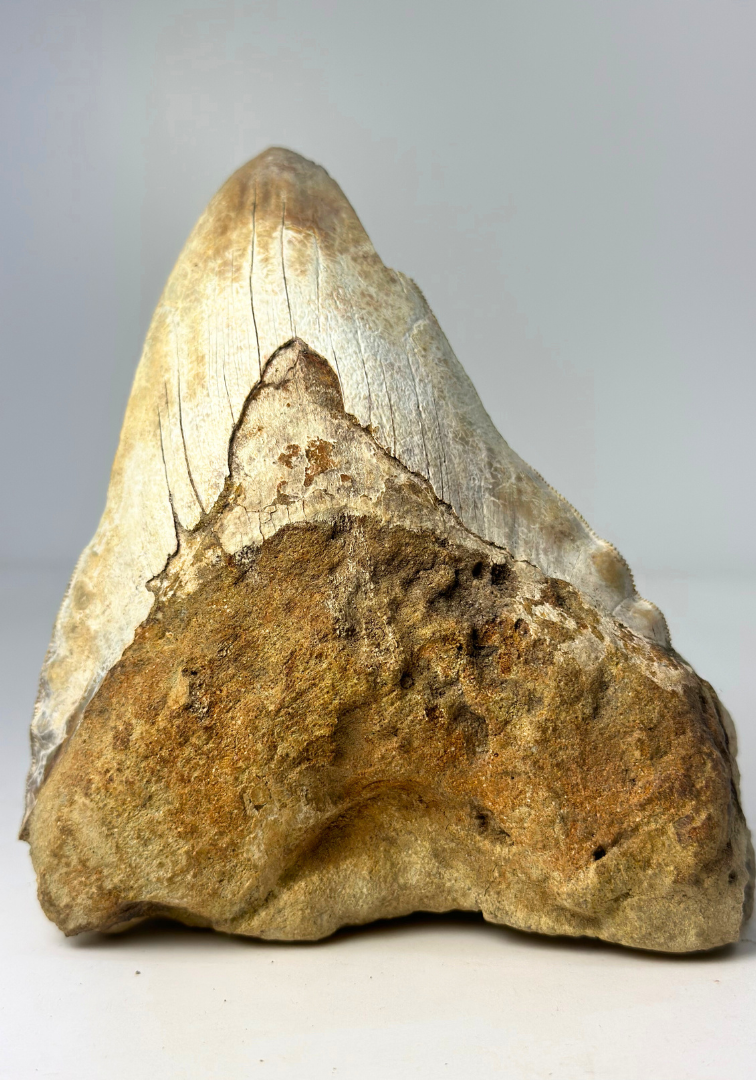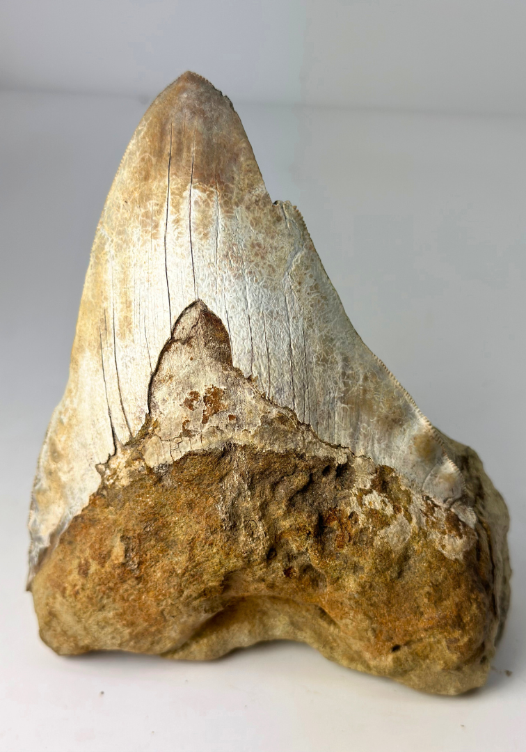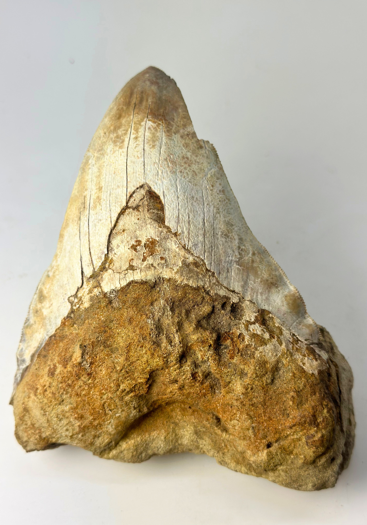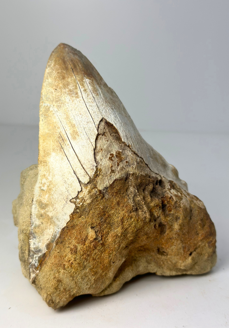 Este hermoso diente de Megalodón de 14,2 cm (5,59 inch) es excepcionalmente grande y está en perfecto estado (así es como se extrajo el diente del suelo). El diente de Megalodon tiene un hermoso y brillante color blanco/marrón claro - derivado del agua subterránea.