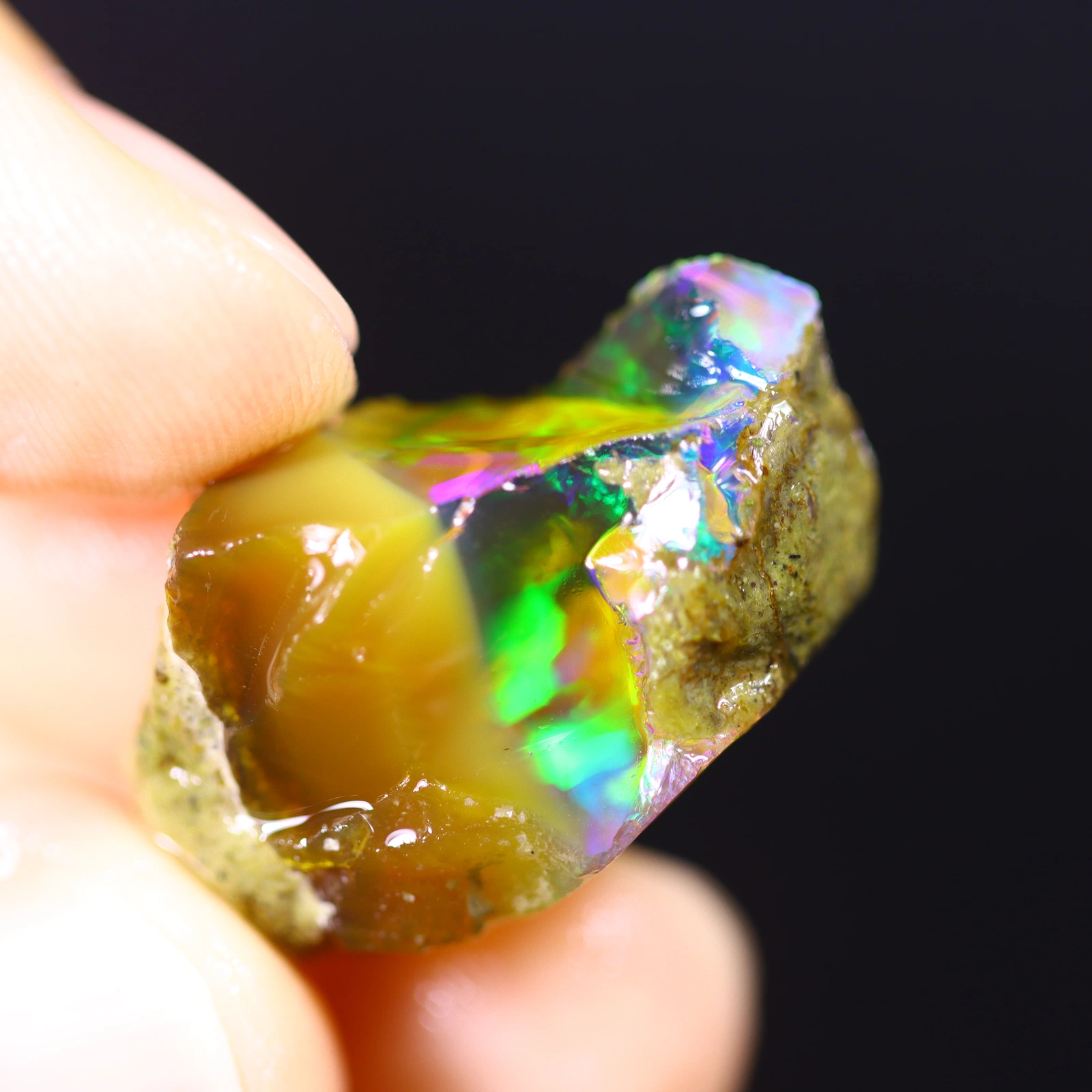 Este ópalo cristalino en bruto único, hallado en Etiopía, exhibe una paleta de colores sin precedentes. Los ópalos de cristal se benefician más si se mantienen húmedos. De este modo se obtienen los mejores colores. Este misterioso ópalo en bruto es un complemento perfecto para cualquier colección. Esta variedad de ópalo es muy apreciada por su hermoso juego de colores. Como puede verse en la imagen, el ópalo tiene un bello aspecto en bruto con colores bien definidos.