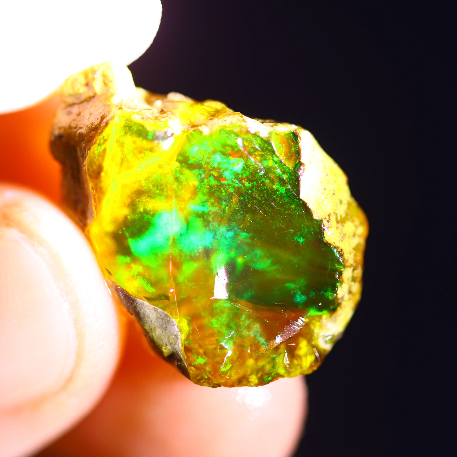 Este ópalo cristalino en bruto único, hallado en Etiopía, exhibe una paleta de colores sin precedentes. Los ópalos de cristal se benefician más si se mantienen húmedos. De este modo se obtienen los mejores colores. Este misterioso ópalo en bruto es un complemento perfecto para cualquier colección. Esta variedad de ópalo es muy apreciada por su hermoso juego de colores. Como puede verse en la imagen, el ópalo tiene un bello aspecto en bruto con colores bien definidos.