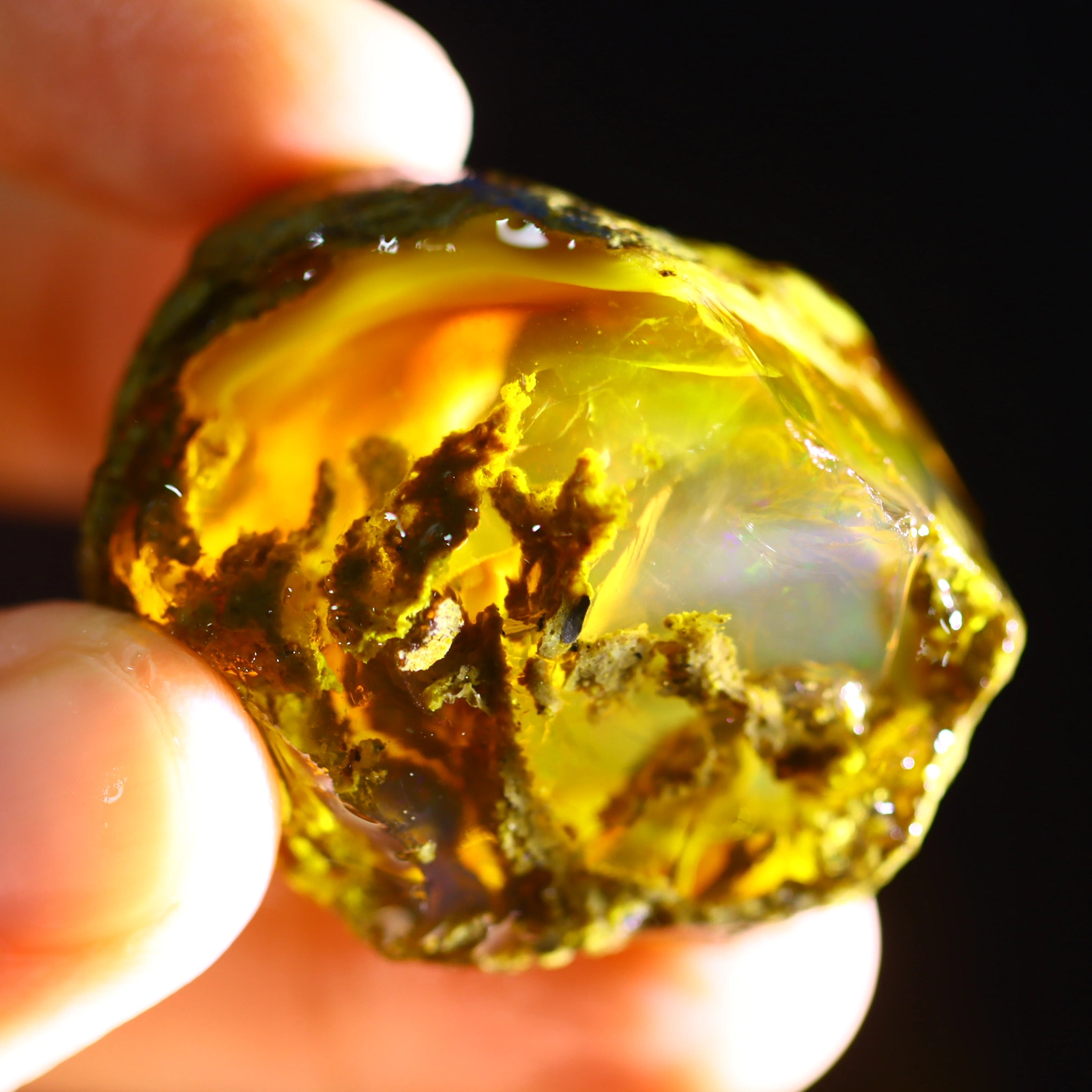 Los ópalos de cristal son un tipo de ópalo de aspecto entre transparente y translúcido. El juego de colores único de esta gema se debe a la refracción y reflexión de la luz en la estructura del ópalo. El resultado es un fascinante despliegue de colores que van del azul al verde, pasando por el amarillo, el naranja, el rojo e incluso el violeta. Estos colores pueden presentarse en diferentes patrones e intensidades, lo que confiere a cada ópalo cristalino un aspecto único.