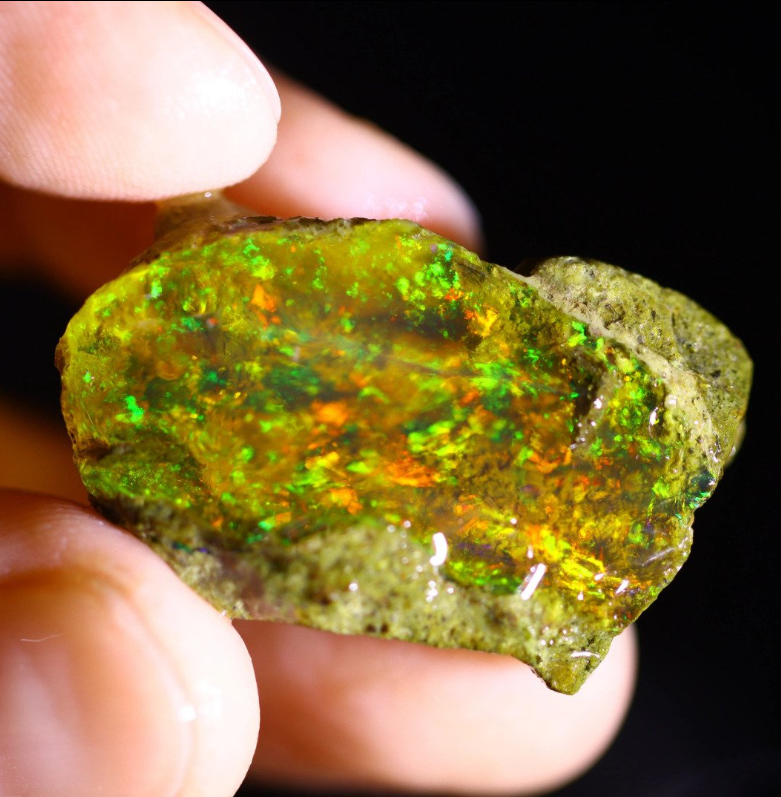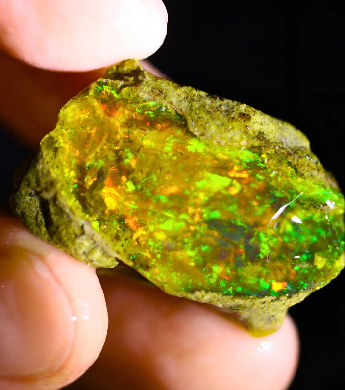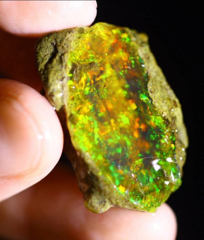 Este ópalo cristalino en bruto único, hallado en Etiopía, exhibe una paleta de colores sin precedentes con el amarillo como color principal. Los ópalos de cristal se benefician más si se mantienen húmedos. De este modo se obtienen los mejores colores. Este misterioso ópalo en bruto es un complemento perfecto para cualquier colección. Esta variedad de ópalo es muy apreciada por su hermoso juego de colores. Como puede verse en la imagen, el ópalo tiene un bello aspecto en bruto con colores bien definidos.