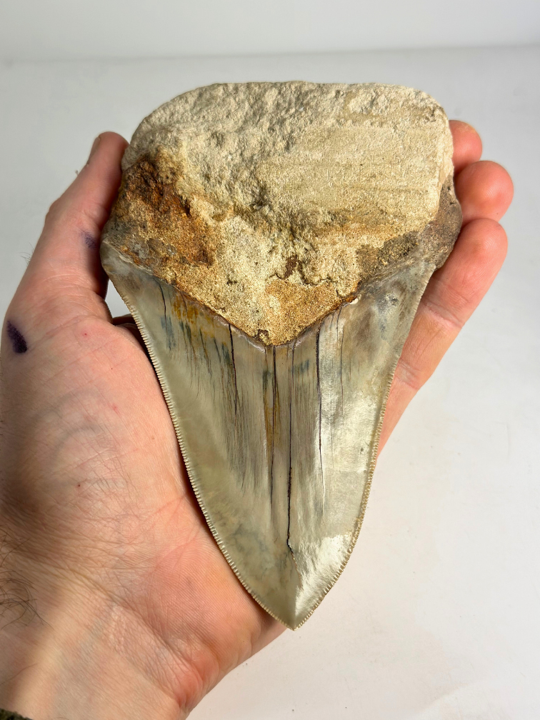 Taille : la taille des dents de mégalodon varie entre 4 cm et 19 cm. En outre, dans certains cas, les dents de mégalodon sont restaurées, de sorte que la racine peut être légèrement plus grande et la dent peut sembler plus légère. Cela ne signifie pas que la dent est fausse. La dent est tout simplement 100% réelle, mais quelque chose s'est cassé lors de l'extraction ou du surfaçage. Pour redonner à la dent toute sa splendeur, on restaure souvent la racine et, très rarement, l'émail.
