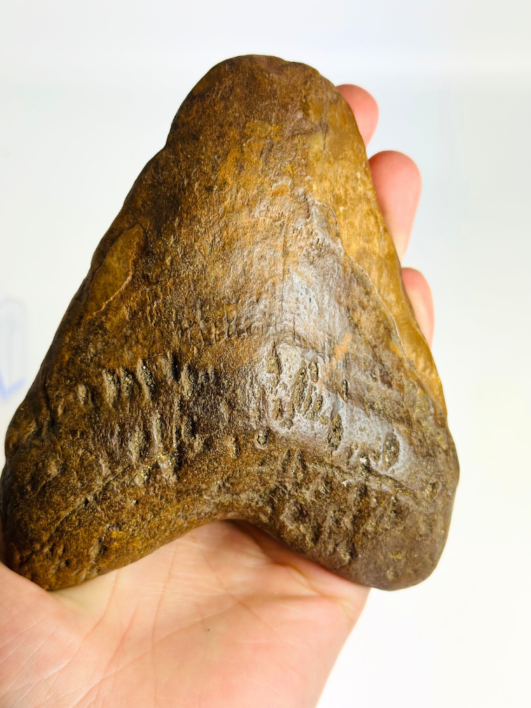 Taille : la taille des dents de mégalodon varie entre 4 cm et 19 cm. En outre, dans certains cas, les dents de mégalodon sont restaurées, de sorte que la racine peut être légèrement plus grande et la dent peut sembler plus légère. Cela ne signifie pas que la dent est fausse. La dent est tout simplement 100% réelle, mais quelque chose s'est cassé lors de l'extraction ou du surfaçage. Pour redonner à la dent toute sa splendeur, on restaure souvent la racine et, très rarement, l'émail.