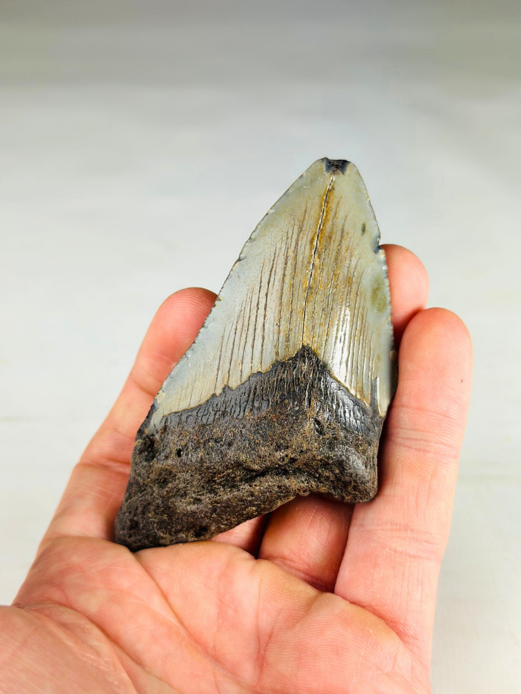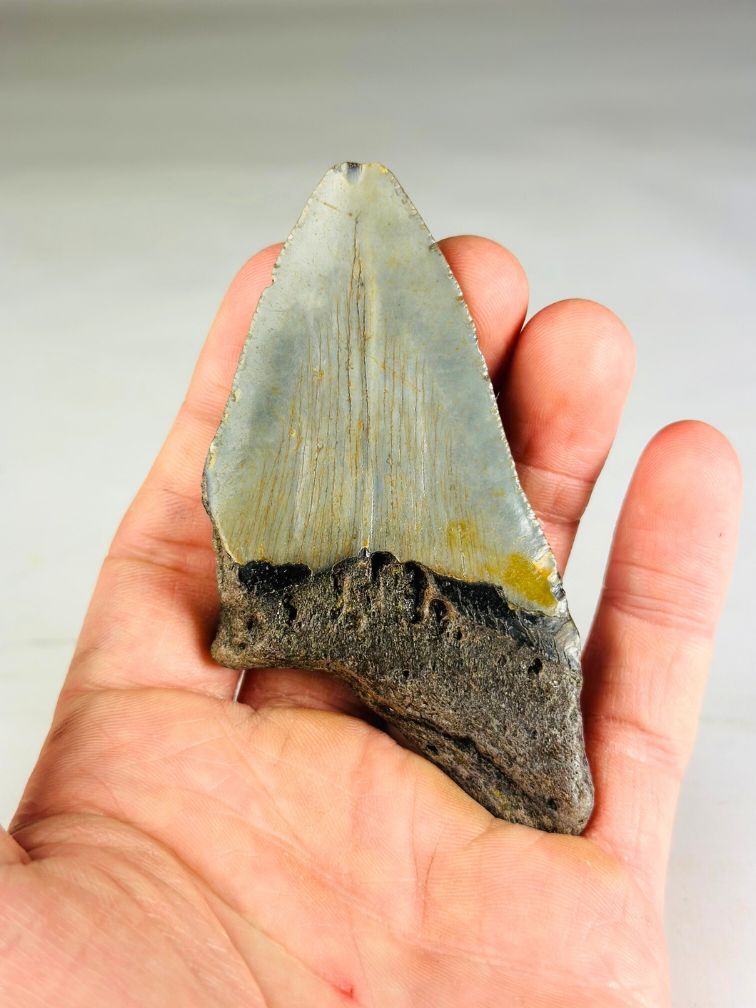 Dimensioni: i denti di Megalodon variano da 4 a 19 cm. Inoltre, in alcuni casi i denti di Megalodon sono stati restaurati, di conseguenza la radice può essere leggermente più grande e il dente può anche sembrare più leggero. Questo non significa che il dente sia falso. Il dente è vero al 100%, ma qualcosa si è rotto durante l'estrazione o l'affioramento. Per riportare il dente al suo pieno splendore, spesso viene restaurata la radice e, molto raramente, lo smalto.