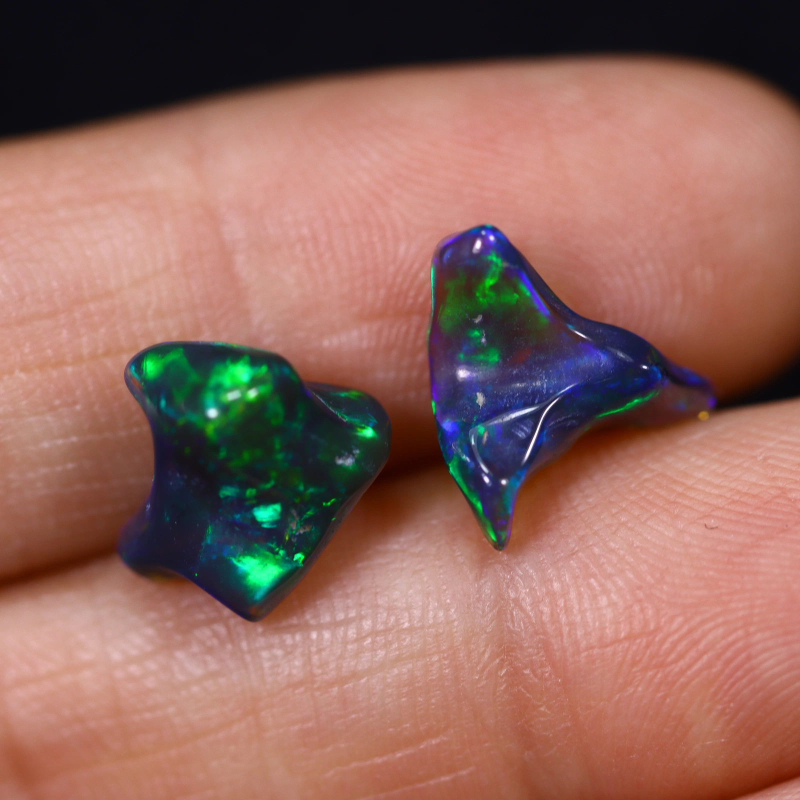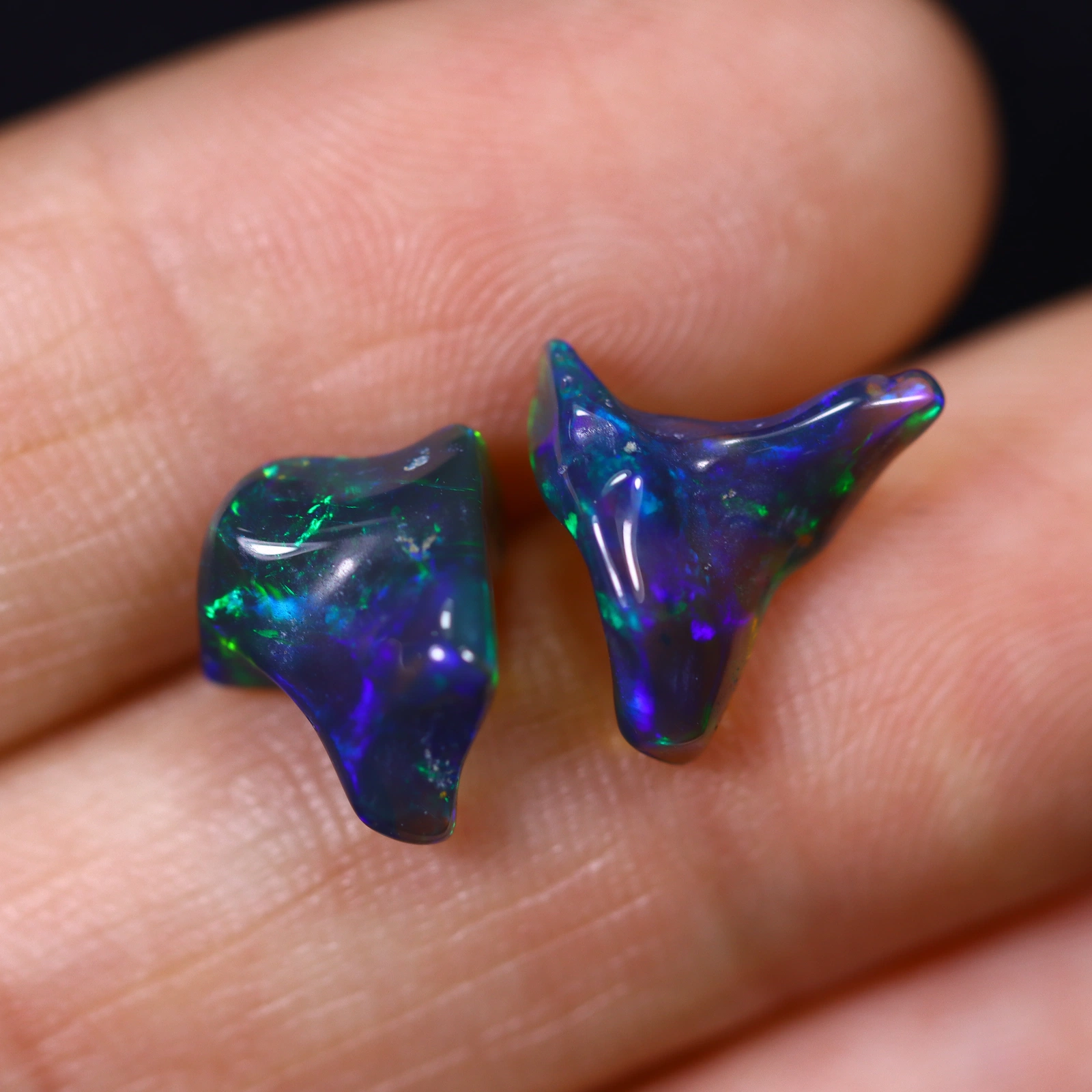 Deze prachtige gerookte opaal, gevonden in Ethiopië, vertoont een ongekend kleurenpalet. bestaat uit twee unieke vrije vormen met glanzend oppervlak en intens diepblauw-groen kleurenspel op een donkere basis. Deze opaal is een perfecte toevoeging aan elke collectie.