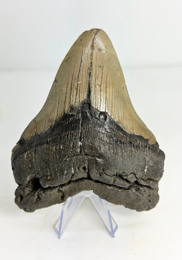 'Monster of Legends' een unieke Megalodon tand uit de VS. Deze tand beschikt over een lengte van 13,8 cm (5,43 inch) met een prachtige grijze kleur. Deze tand heeft een glimmende enamel, een dikke wortel en robuuste randen. Deze tand weegt: 332 gram.