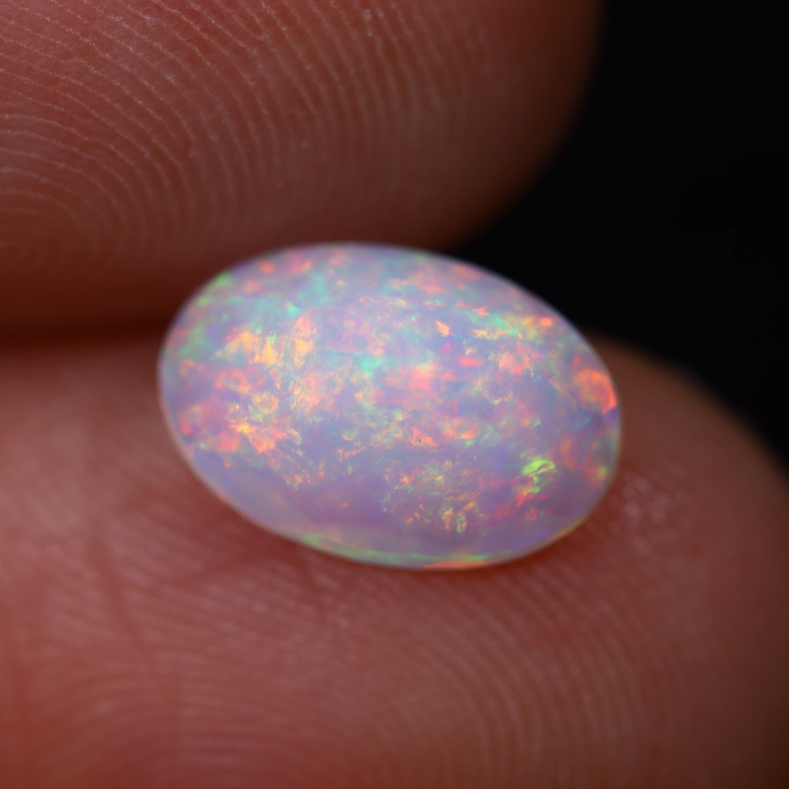 Deze prachtige geslepen opaal, gevonden in Ethiopië, vertoont een ongekend kleurenpalet. vertoont heldere irisatie met rood, groen en blauw en een gladden gepolijste cabochon vorm met transparante doorschijnende delen. Deze opaal is een perfecte toevoeging aan elke collectie.