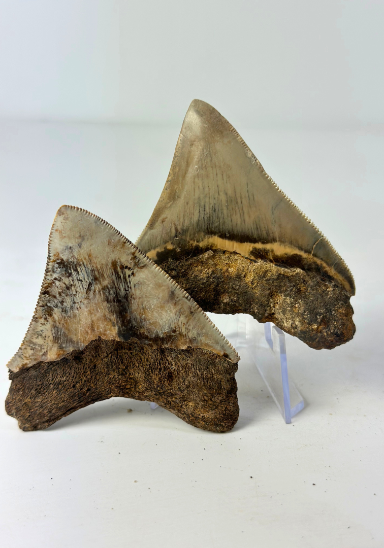 'Holy and Chaos' een unieke set met Megalodon tanden uit Indonesië. Het is een prachtige combinatie met twee totaal verschillende tanden (100% natuurlijk). Een zéér mooie set om te verzamelen.